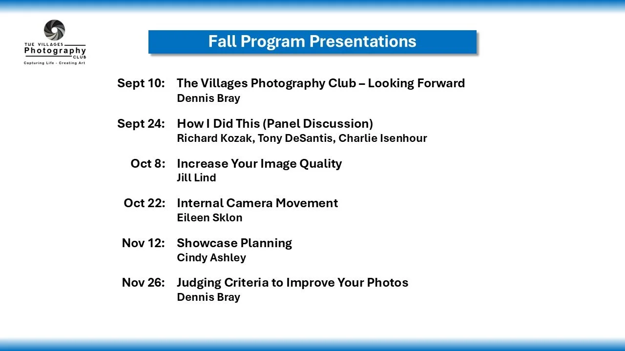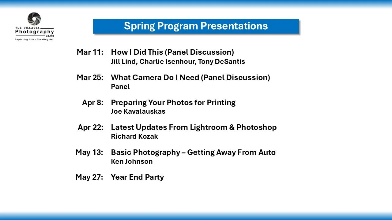 Formal meetings are held on the second and fourth Wednesday of each month from September through May. Informal summer sessions are also held from June through August. The doors open at 12:30 and the meetings start at 1:00 PM.